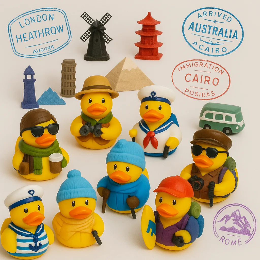 10 assorted travel-themed ducks (styles & colors vary by pack).